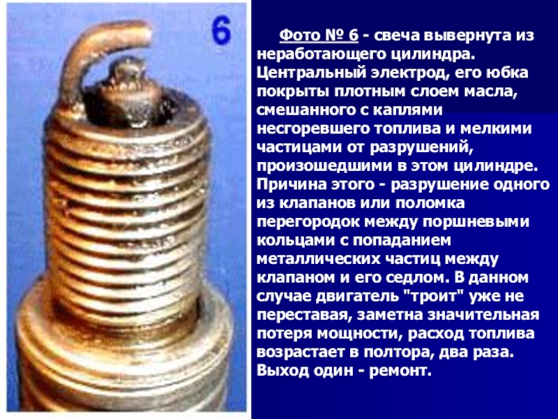 Слайд 30Фото № 6 - свеча вывернута из неработающего цилиндра. Центральный электрод, его