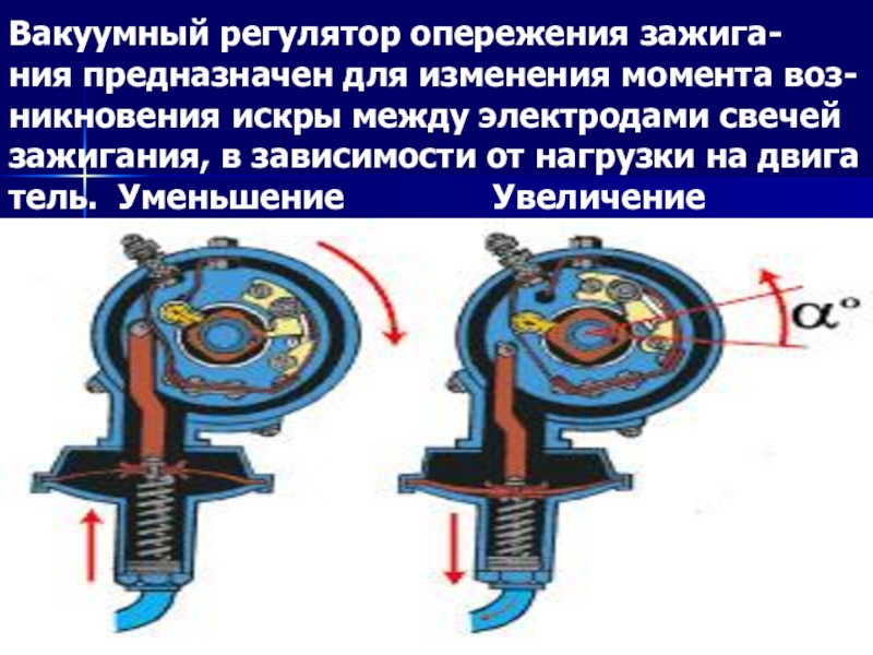 Слайд 14Вакуумный регулятор опережения зажига- ния предназначен для изменения момента воз- никновения искры