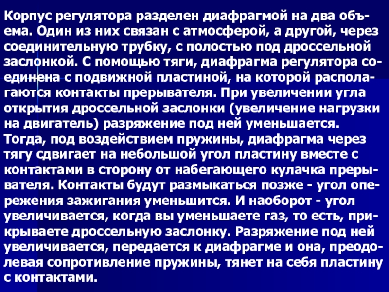 связан с атмосферой, а другой, через соединительную трубку, с полостью под дроссельной заслонкой. С помощью тяги, диафрагма регулятора со- единена с подвижной пластиной, на которой распола- гаются контакты прерывателя. При увеличении угла открытия дроссельной заслонки (увеличение нагрузки на двигатель) разряжение под ней уменьшается. Тогда, под воздействием пружины, диафрагма через тягу сдвигает на небольшой угол пластину вместе с контактами в сторону от набегающего кулачка преры- вателя. Контакты будут размыкаться позже - угол опе- режения зажигания уменьшится. И наоборот - угол увеличивается, когда вы уменьшаете газ, то есть, при- крываете дроссельную заслонку. Разряжение под ней увеличивается, передается к диафрагме и она, преодо- левая сопротивление пружины, тянет на себя пластину с контактами.