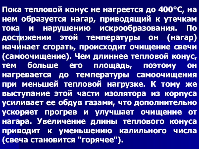 приводящий к утечкам тока и нарушению искрообразования. По достижении этой температуры он (нагар) начинает сгорать, происходит очищение свечи (самоочищение). Чем длиннее тепловой конус, тем больше его площадь, поэтому он нагревается до температуры самоочищения при меньшей тепловой нагрузке. К тому же выступание этой части изолятора из корпуса усиливает ее обдув газами, что дополнительно ускоряет прогрев и улучшает очищение от нагара. Увеличение длины теплового конуса приводит к уменьшению калильного числа (свеча становится "горячее").