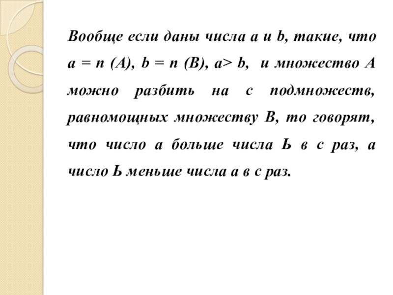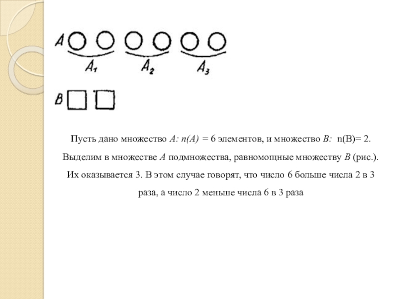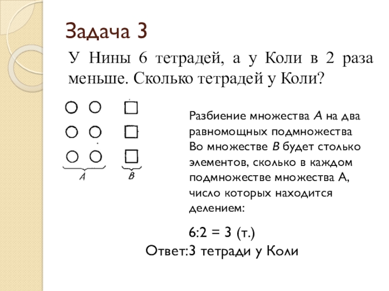 Разбиение множества А на два равномощных подмножества Во множестве В будет столько элементов, сколько в каждом подмножестве множества А, число которых находится делением:
