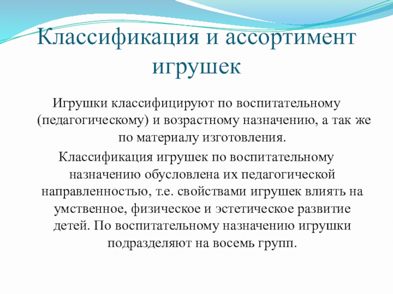 Игрушки классифицируют по воспитательному (педагогическому) и возрастному назначению,