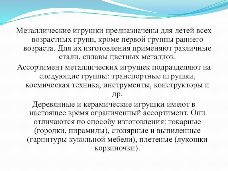 Слайд 14Металлические игрушки предназначены для детей всех возрастных групп, кроме первой группы
