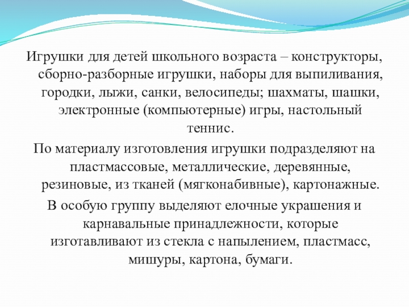 Слайд 12Игрушки для детей школьного возраста – конструкторы, сборно-разборные игрушки, наборы для