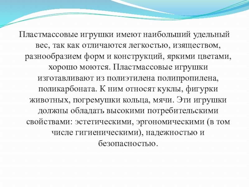 Слайд 13Пластмассовые игрушки имеют наибольший удельный вес, так как отличаются легкостью, изяществом,
