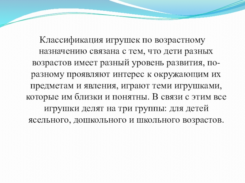 Слайд 7Классификация игрушек по возрастному назначению связана с тем, что дети разных