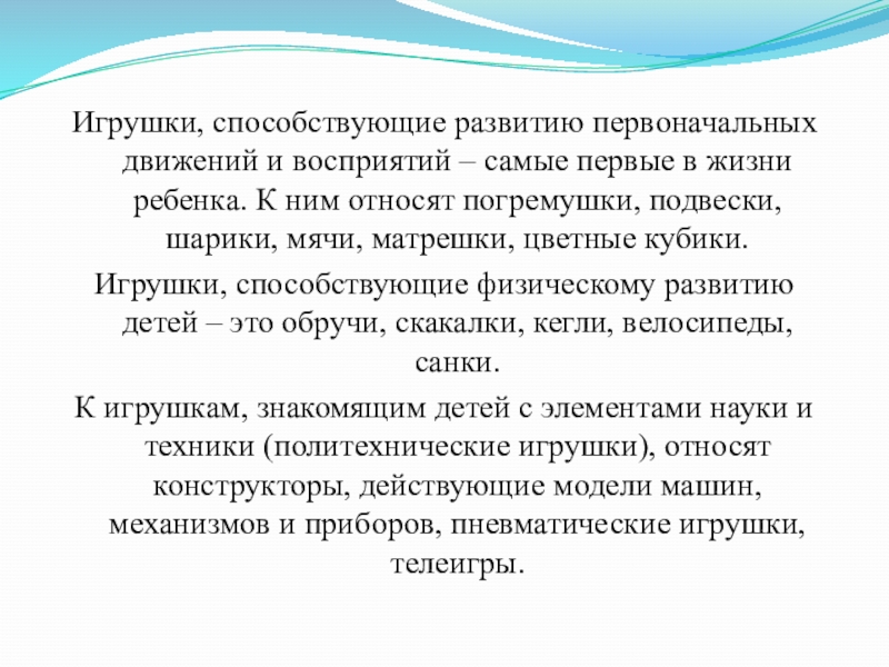 Слайд 5Игрушки, способствующие развитию первоначальных движений и восприятий – самые первые в
