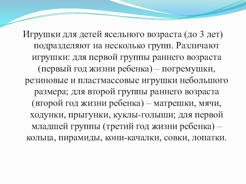 Слайд 9Игрушки для детей ясельного возраста (до 3 лет) подразделяют на несколько