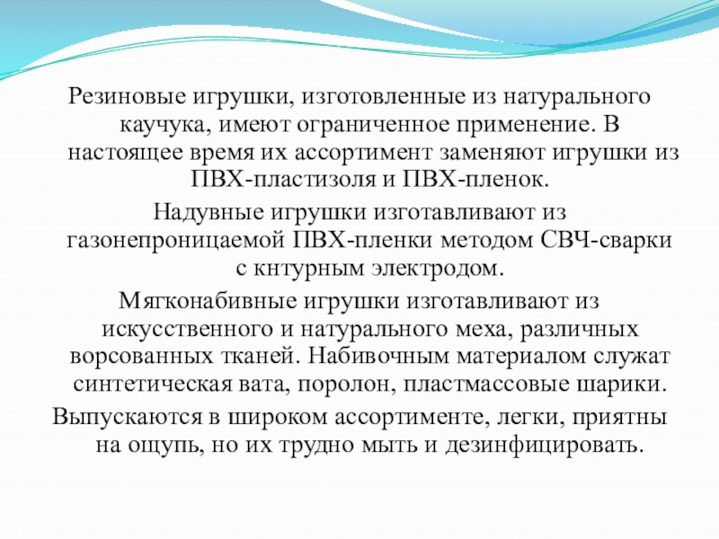 Слайд 15Резиновые игрушки, изготовленные из натурального каучука, имеют ограниченное применение. В настоящее