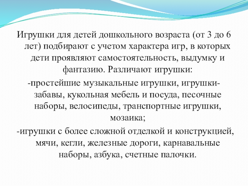 Слайд 10Игрушки для детей дошкольного возраста (от 3 до 6 лет) подбирают