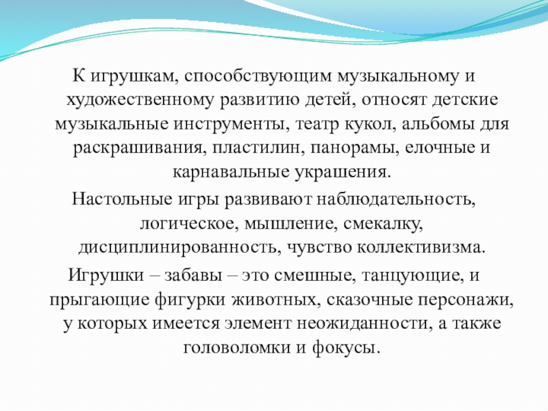 Слайд 6К игрушкам, способствующим музыкальному и художественному развитию детей, относят детские музыкальные