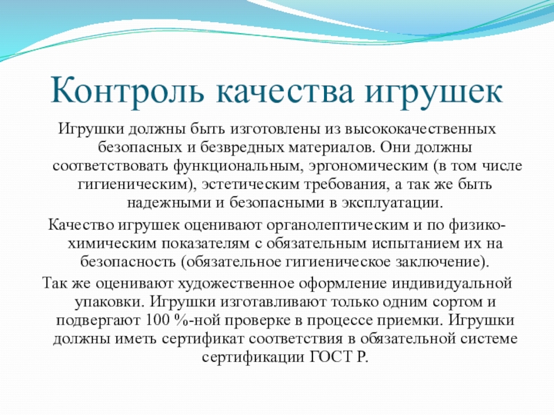 Так же оценивают художественное оформление индивидуальной упаковки. Игрушки изготавливают только одним сортом и подвергают 100 %-ной проверке в процессе приемки. Игрушки должны иметь сертификат соответствия в обязательной системе сертификации ГОСТ Р.