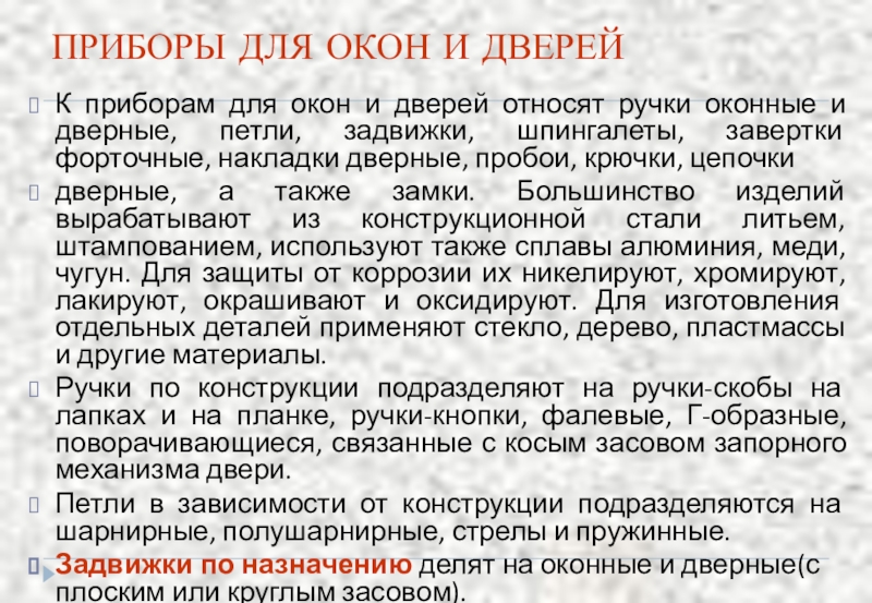 относят ручки оконные и дверные, петли, задвижки, шпингалеты, завертки форточные, накладки дверные, пробои, крючки, цепочки