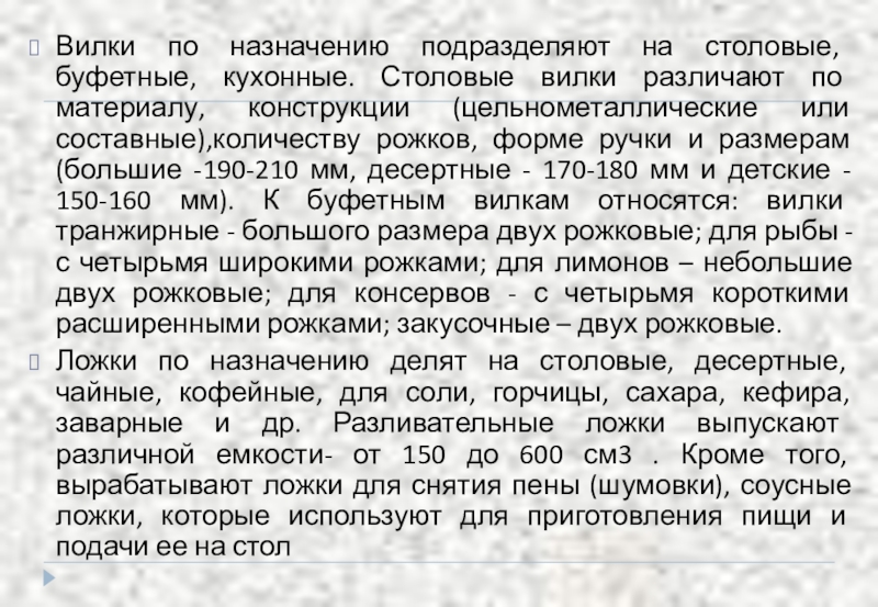 Слайд 66Вилки по назначению подразделяют на столовые, буфетные, кухонные. Столовые вилки различают