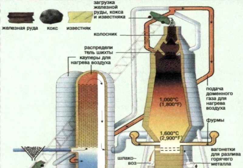ПРОИСХОДИТ В ДОМЕННОЙ ПЕЧИ. СЫРЬЕМ ДЛЯ ПРОИЗВОДСТВА ЯВЛЯЮТСЯ ЖЕЛЕЗНЫЕ