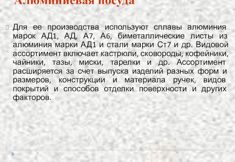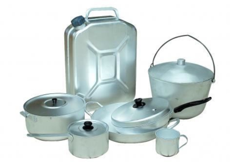 А7, А6, биметаллические листы из алюминия марки АД1 и стали марки Ст7 и др. Видовой ассортимент включает кастрюли, сковороды, кофейники, чайники, тазы, миски, тарелки и др. Ассортимент расширяется за счет выпуска изделий разных форм и размеров, конструкции и материала ручек, видов покрытий и способов отделки поверхности и других факторов.