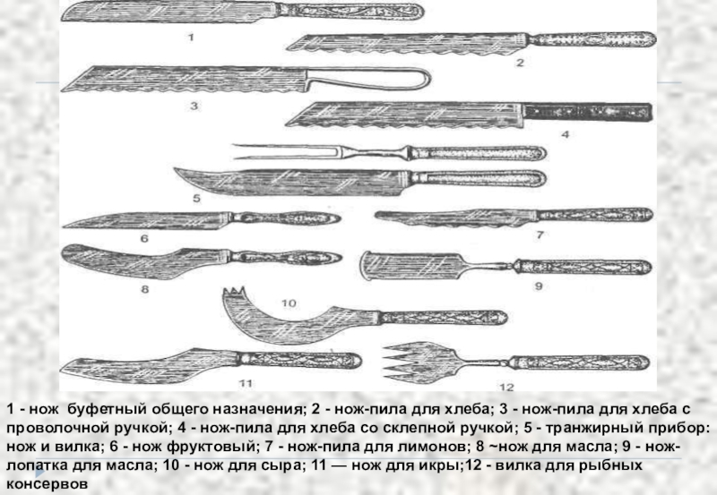 3 - нож-пила для хлеба с проволочной ручкой; 4 - нож-пила для хлеба со склепной ручкой; 5 - транжирный прибор: нож и вилка; 6 - нож фруктовый; 7 - нож-пила для лимонов; 8 ~нож для масла; 9 - нож-лопатка для масла; 10 - нож для сыра; 11 — нож для икры;12 - вилка для рыбных консервов