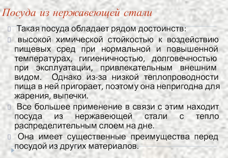 стойкостью к воздействию пищевых сред при нормальной и повышенной температурах, гигиеничностью, долговечностью при эксплуатации, привлекательным внешним видом. Однако из-за низкой теплопроводности пища в ней пригорает, поэтому она непригодна для жарения, выпечки.