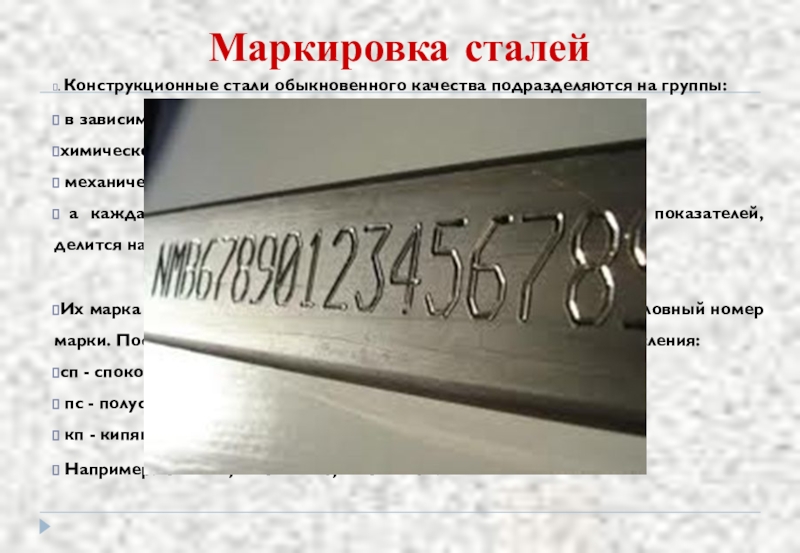 Их марка обозначается буквами Ст (сталь) и цифрами от 0 до 6 - условный номер марки. После цифр буквенные индексы указывают на степень раскисления: