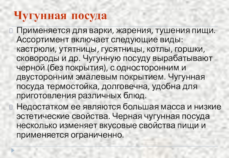 Недостатком ее являются большая масса и низкие эстетические свойства. Черная чугунная посуда несколько изменяет вкусовые свойства пищи и применяется ограниченно.