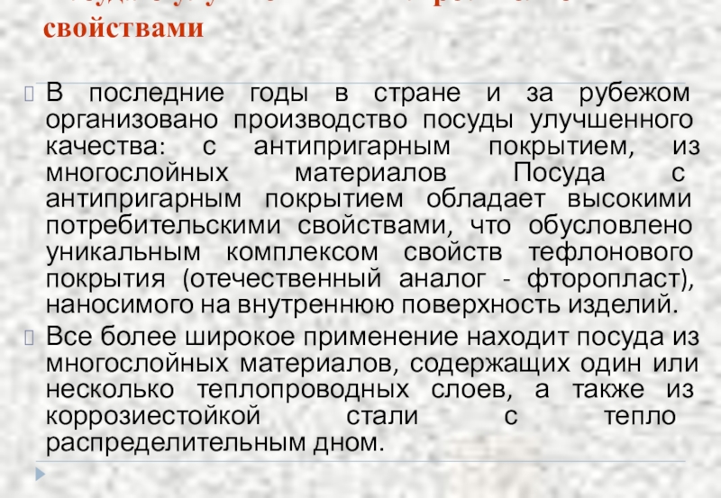 рубежом организовано производство посуды улучшенного качества: с антипригарным покрытием, из многослойных материалов Посуда с антипригарным покрытием обладает высокими потребительскими свойствами, что обусловлено уникальным комплексом свойств тефлонового покрытия (отечественный аналог - фторопласт), наносимого на внутреннюю поверхность изделий.