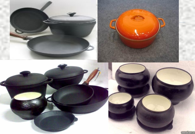 виды: кастрюли, утятницы, гусятницы, котлы, горшки, сковороды и др. Чугунную посуду вырабатывают черной (без покрытия), с односторонним и двусторонним эмалевым покрытием. Чугунная посуда термостойка, долговечна, удобна для приготовления различных блюд.