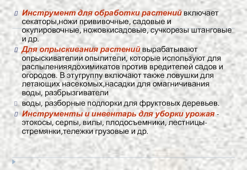 Слайд 73Инструмент для обработки растений включает секаторы,ножи прививочные, садовые и окулировочные, ножовкисадовые,