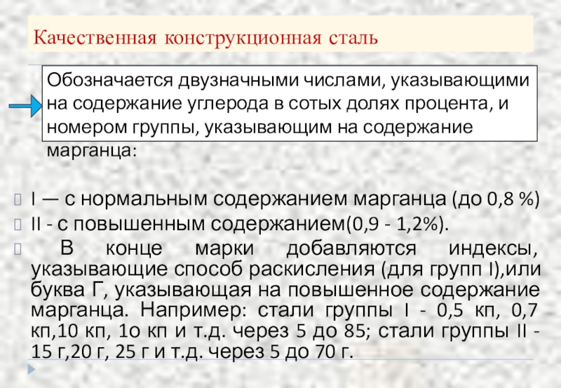 В конце марки добавляются индексы, указывающие способ раскисления (для групп I),или буква Г, указывающая на повышенное содержание марганца. Например: стали группы I - 0,5 кп, 0,7 кп,10 кп, 1о кп и т.д. через 5 до 85; стали группы II - 15 г,20 г, 25 г и т.д. через 5 до 70 г.