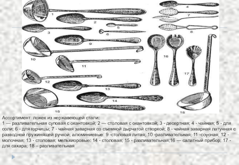 — столовая с окантовкой; 3 - десертная; 4 - чайная; 5 - для соли; 6 - для горчицы; 7 - чайная заварная со съемной дырчатой створкой; 8 - чайная заварная латунная с разводной пружинящей ручкой; алюминиевые: 9 -столовая литая; 10 -разливательная; 11 -соусная; 12 - молочная; 13 - столовая; мельхиоровые: 14 - столовая; 15 - разливательная;16 — салатный прибор; 17 - для сахара; 18 – разливательная