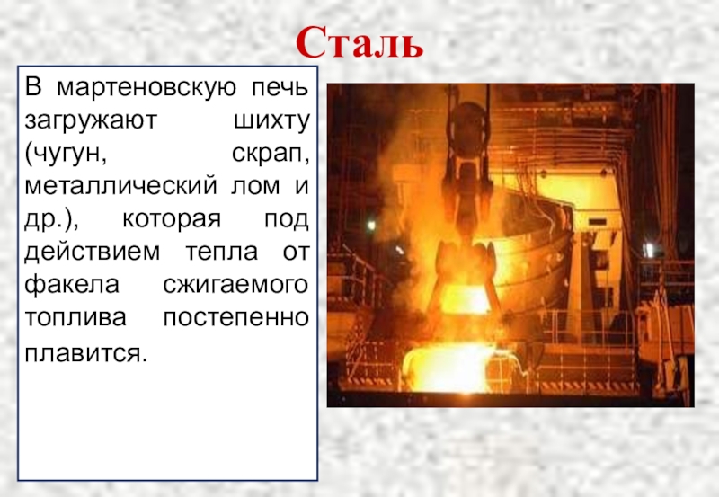 В мартеновскую печь загружают шихту (чугун, скрап, металлический лом и др.),