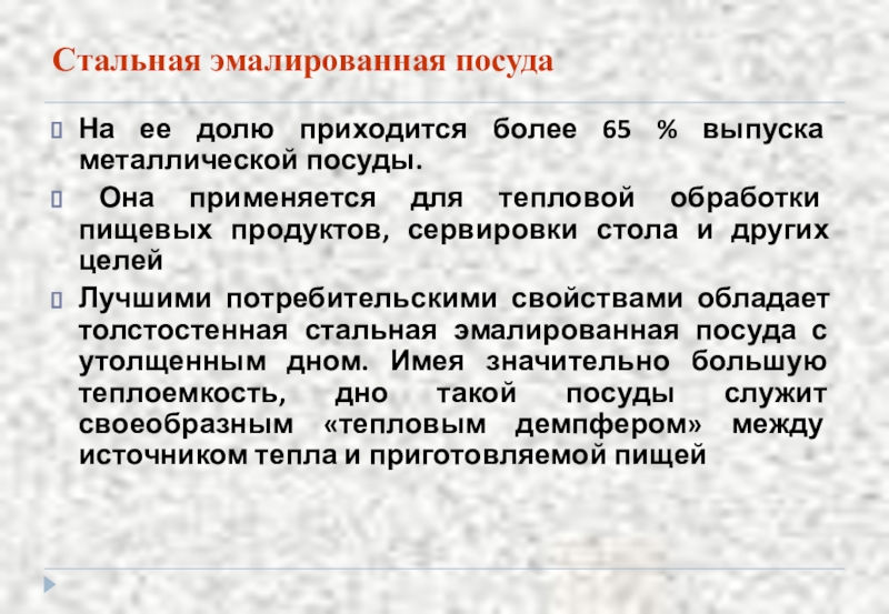 Лучшими потребительскими свойствами обладает толстостенная стальная эмалированная посуда с утолщенным дном. Имея значительно большую теплоемкость, дно такой посуды служит своеобразным «тепловым демпфером» между источником тепла и приготовляемой пищей