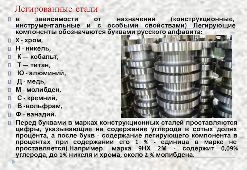 Легирующие компоненты обозначаются буквами русского алфавита: