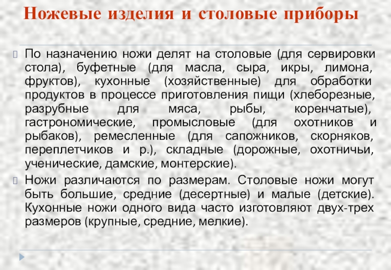 сервировки стола), буфетные (для масла, сыра, икры, лимона, фруктов), кухонные (хозяйственные) для обработки продуктов в процессе приготовления пищи (хлеборезные, разрубные для мяса, рыбы, коренчатые), гастрономические, промысловые (для охотников и рыбаков), ремесленные (для сапожников, скорняков, переплетчиков и р.), складные (дорожные, охотничьи, ученические, дамские, монтерские).