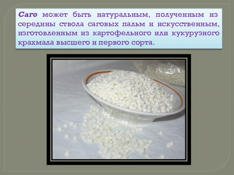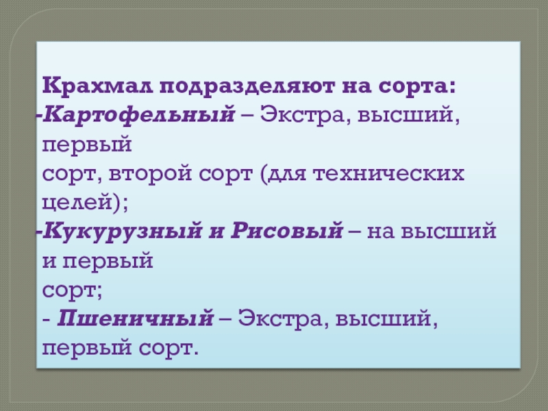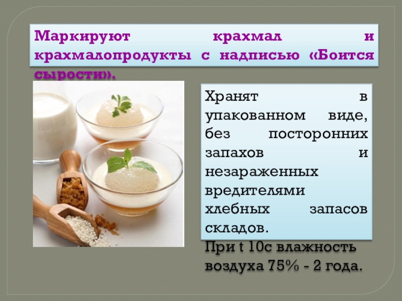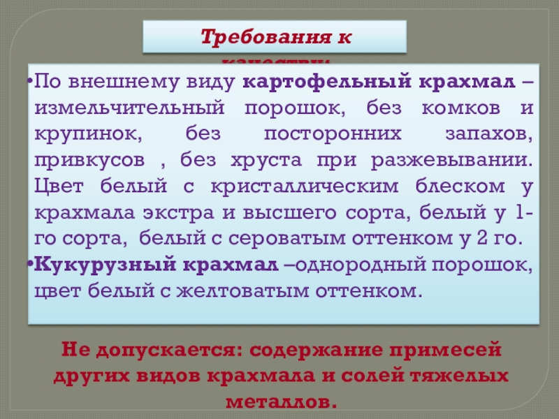 Не допускается: содержание примесей других видов крахмала и солей тяжелых металлов.