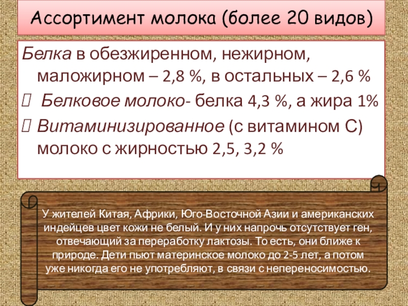 У жителей Китая, Африки, Юго-Восточной Азии и американских индейцев цвет кожи не белый. И у них напрочь отсутствует ген, отвечающий за переработку лактозы. То есть, они ближе к природе. Дети пьют материнское молоко до 2-5 лет, а потом уже никогда его не употребляют, в связи с непереносимостью.
