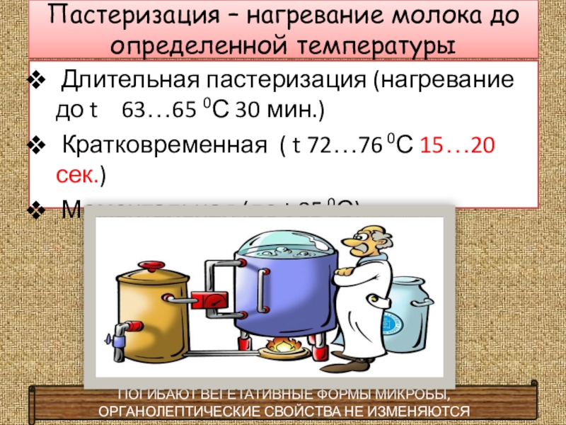 ПОГИБАЮТ ВЕГЕТАТИВНЫЕ ФОРМЫ МИКРОБЫ, ОРГАНОЛЕПТИЧЕСКИЕ СВОЙСТВА НЕ ИЗМЕНЯЮТСЯ