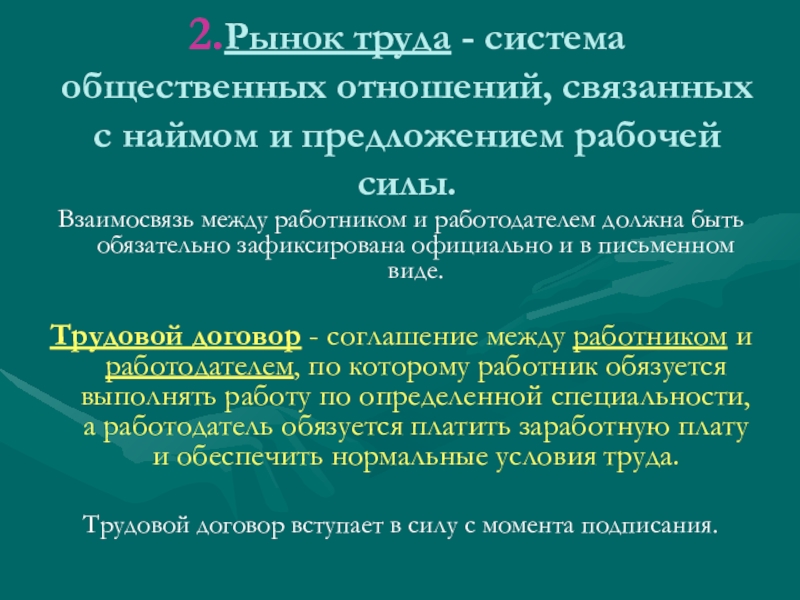 Трудовой договор - соглашение между работником и работодателем, по которому работник обязуется выполнять работу по определенной специальности, а работодатель обязуется платить заработную плату и обеспечить нормальные условия труда.