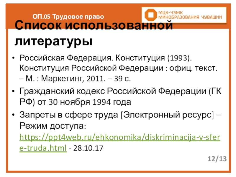 Запреты в сфере труда [Электронный ресурс] – Режим доступа: https://ppt4web.ru/ehkonomika/diskriminacija-v-sfere-truda.html - 28.10.17