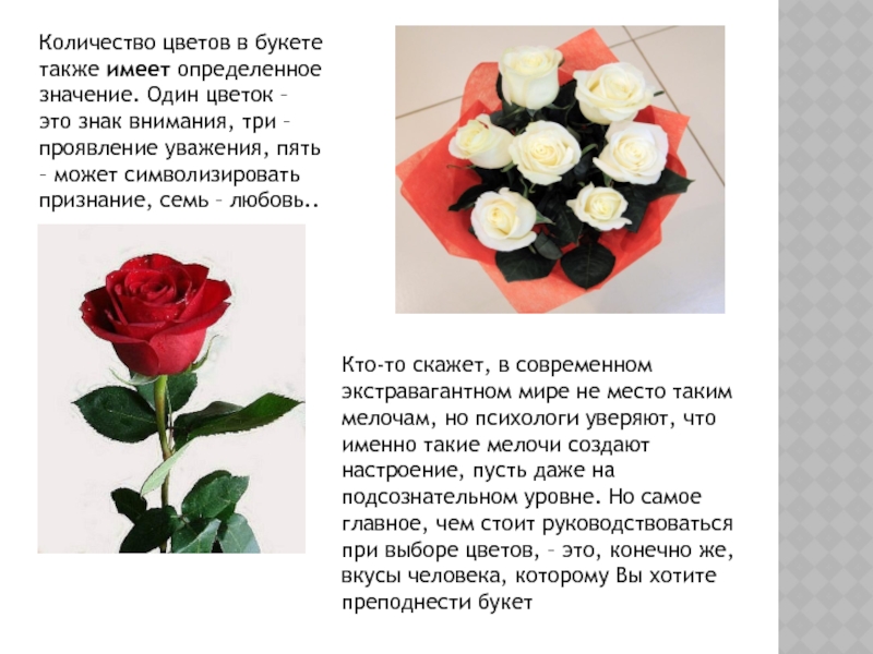 Кто-то скажет, в современном экстравагантном мире не место таким мелочам, но психологи уверяют, что именно такие мелочи создают настроение, пусть даже на подсознательном уровне. Но самое главное, чем стоит руководствоваться при выборе цветов, – это, конечно же, вкусы человека, которому Вы хотите преподнести букет