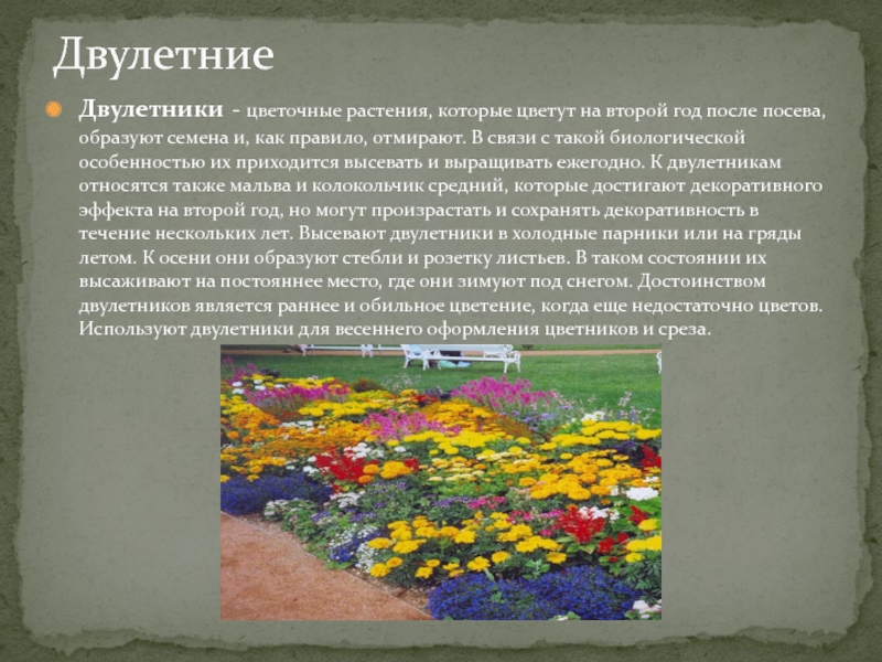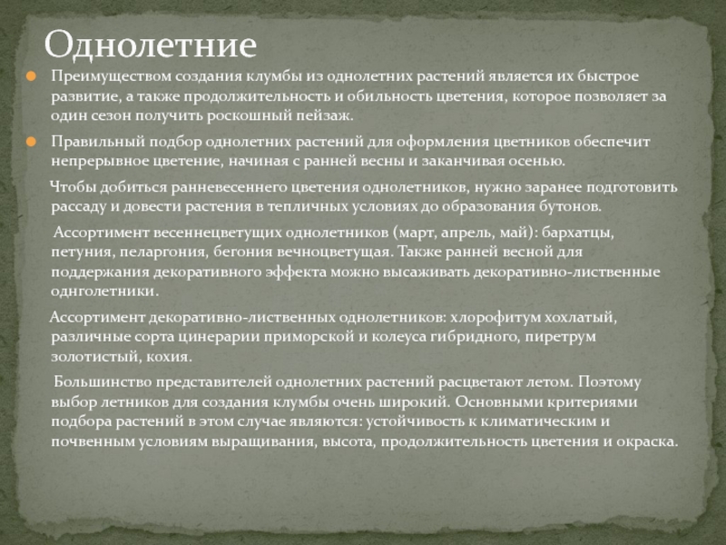 Ассортимент весеннецветущих однолетников (март, апрель, май): бархатцы, петуния, пеларгония, бегония вечноцветущая. Также ранней весной для поддержания декоративного эффекта можно высаживать декоративно-лиственные однголетники.