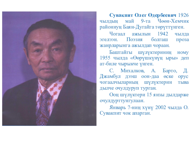 Слайд 3Сувакпит Олег Өдербеевич 1926 чылдың май 9-та Чөөн-Хемчик районнуң Баян-Дугайга төрүттүнген.