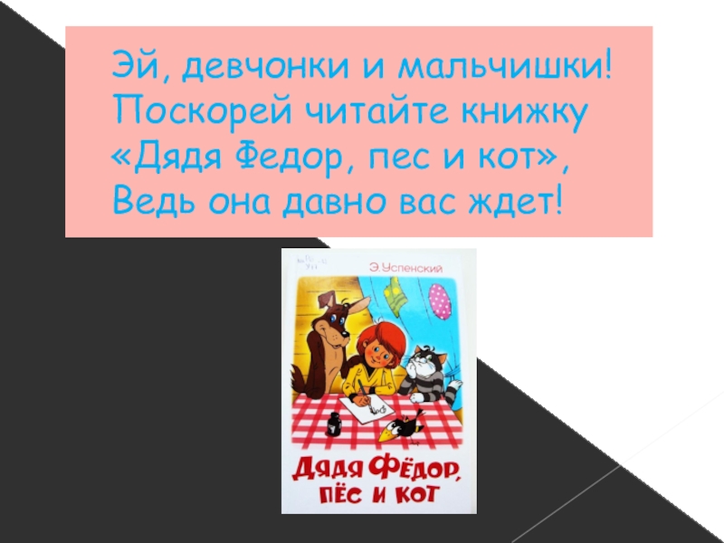 Слайд 26 Эй, девчонки и мальчишки! Поскорей читайте книжку «Дядя Федор, пес и кот», Ведь она