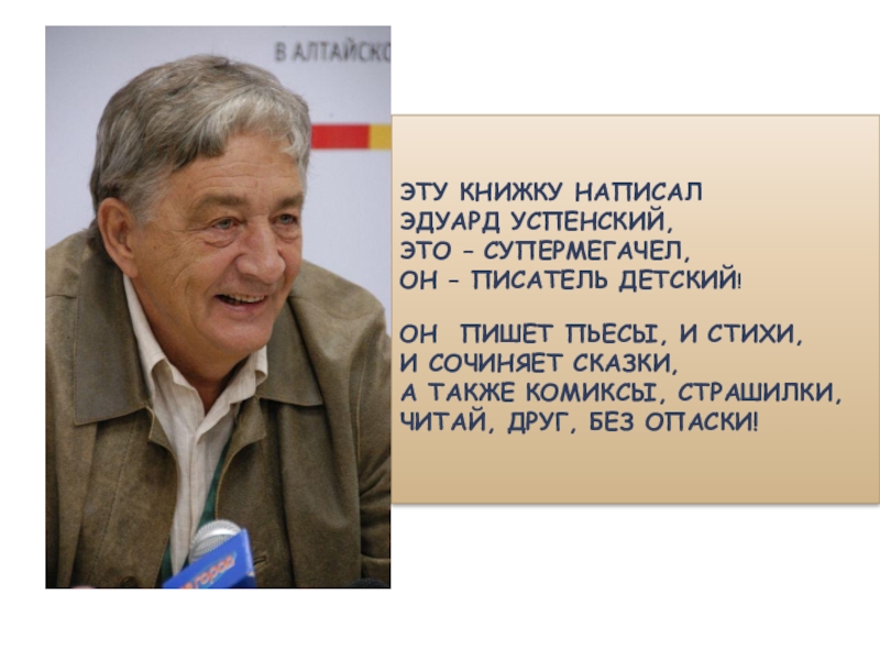 ЭТУ КНИЖКУ НАПИСАЛЭДУАРД УСПЕНСКИЙ,ЭТО – СУПЕРМЕГАЧЕЛ,ОН – ПИСАТЕЛЬ ДЕТСКИЙ!ОН ПИШЕТ ПЬЕСЫ, И СТИХИ, И СОЧИНЯЕТ СКАЗКИ,А ТАКЖЕ