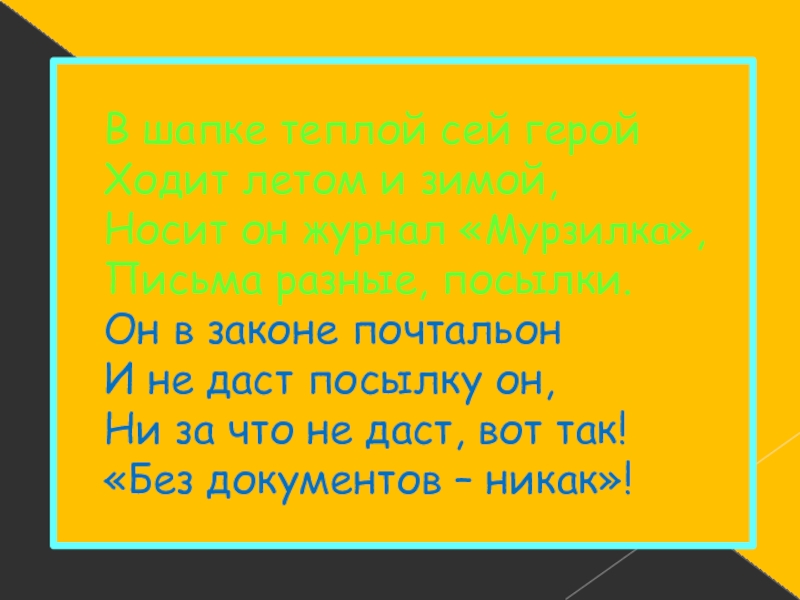 разные, посылки. Он в законе почтальон И не даст посылку он, Ни за что не даст, вот так! «Без документов – никак»!