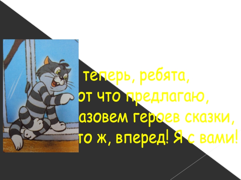 А теперь, ребята, Вот что предлагаю, Назовем героев сказки,  Что ж, вперед! Я с вами!