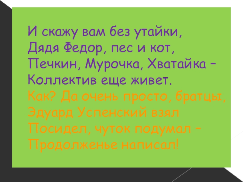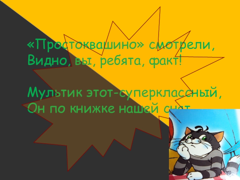 Слайд 25«Простоквашино» смотрели, Видно, вы, ребята, факт! Мультик этот-суперклассный, Он по книжке нашей снят.