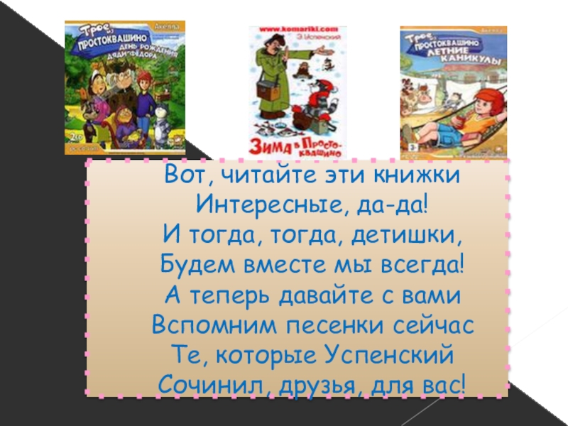 всегда! А теперь давайте с вами Вспомним песенки сейчас Те, которые Успенский Сочинил, друзья, для вас!