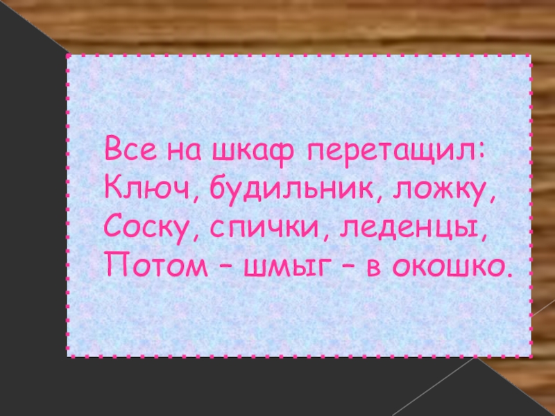Слайд 23Все на шкаф перетащил: Ключ, будильник, ложку, Соску, спички, леденцы, Потом – шмыг –