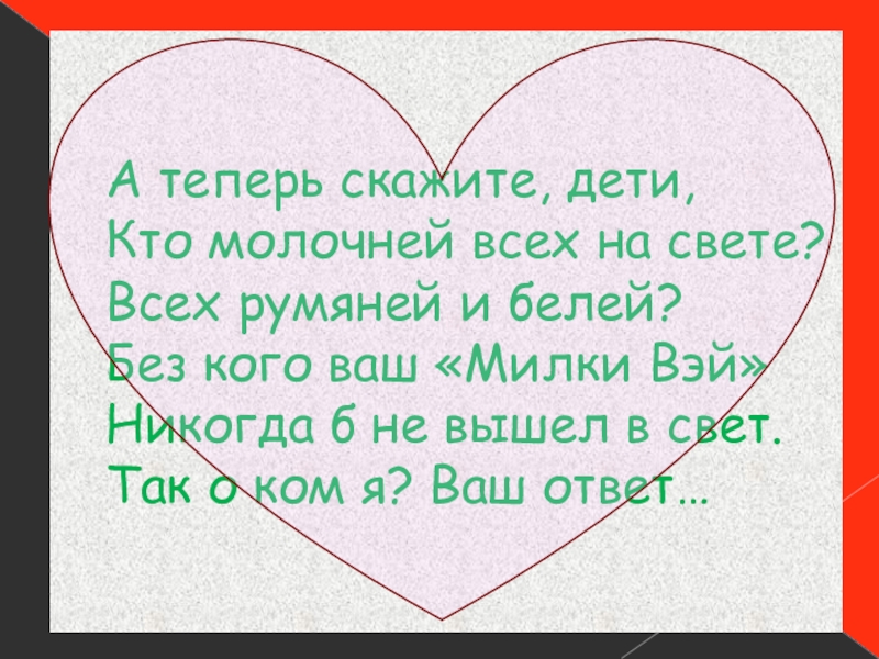 А теперь скажите, дети, Кто молочней всех на свете? Всех румяней и белей? Без кого ваш «Милки