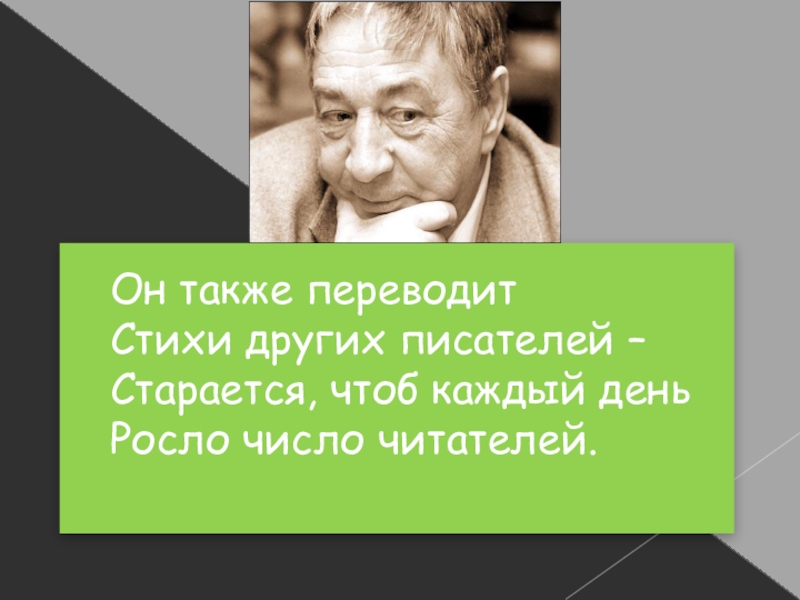 Слайд 6 Он также переводит Стихи других писателей – Старается, чтоб каждый день Росло число